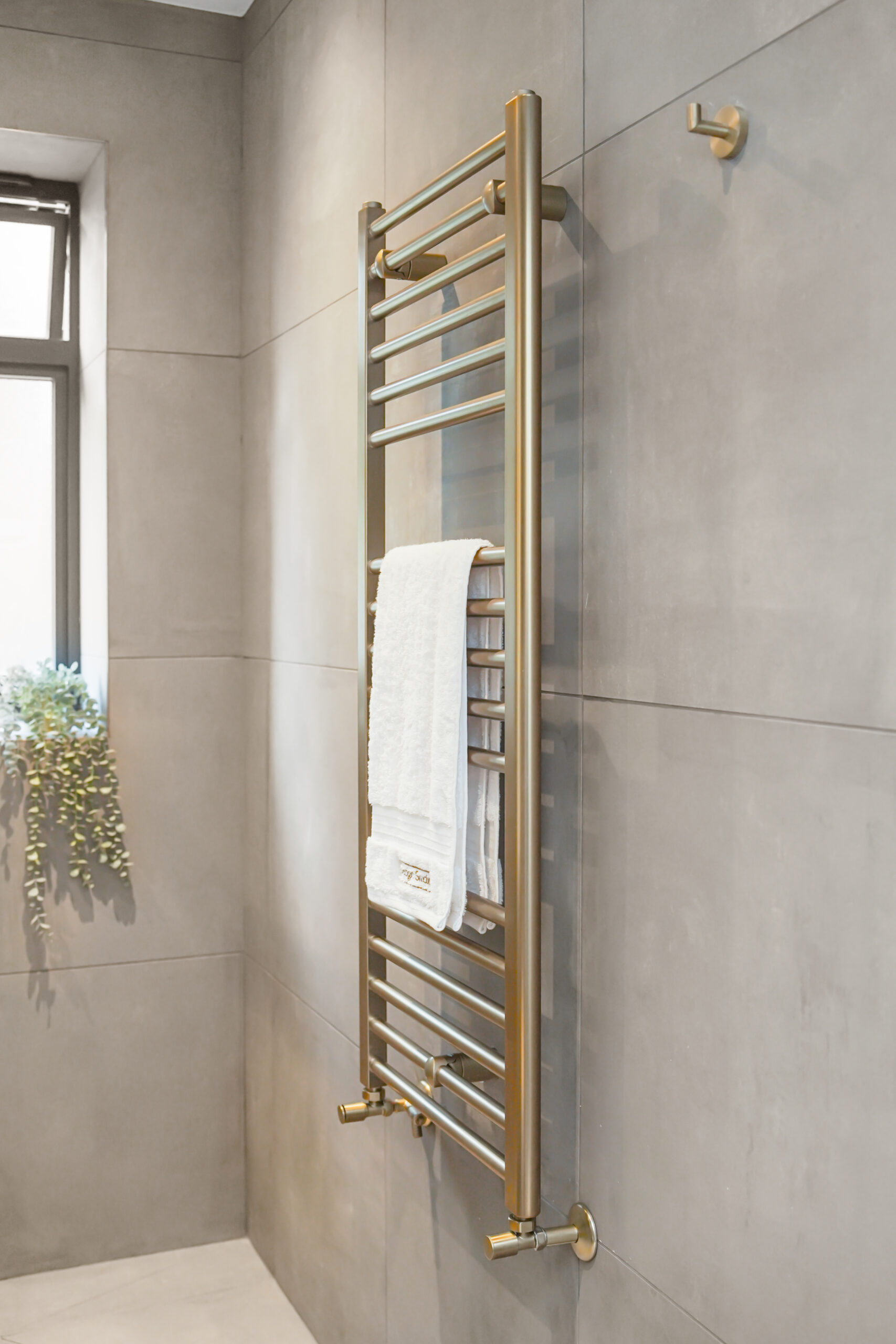 At the heart of the design is a striking freestanding bath, positioned beside a feature walk-in shower in a rich dark bronze finish. Elegant brushed nickel brassware adds a contemporary touch throughout—flowing seamlessly from the bath to the shower and double basin area.